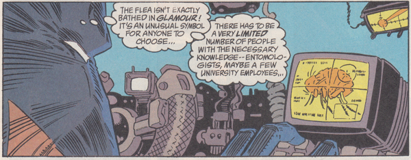 Being that The Flea's using technology to allow him to leap all over the place, I'd guess an engineer would be a more likely culprit than a flea expert. It's not like you have to be a flea expert to gather fleas to throw at people you want to rob. You just have to be a filthy, disgusting person! In my mind, I keep replacing "flea" with "pubic louse" to make the story more entertaining. "The pubic louse isn't exactly bathed in glamour!" You're not kidding, Batman!