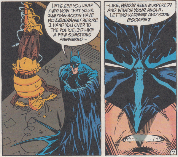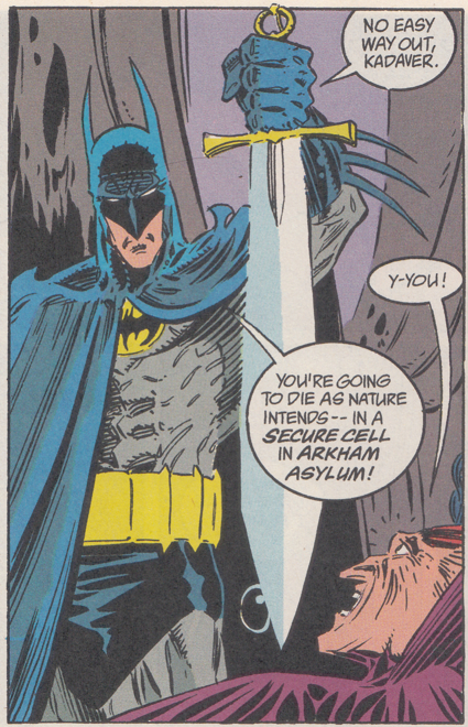 Kadaver's about to die painfully from a brain tumor, probably suffering for weeks, all while in the non-comfort of a prison cell. So Batman saves his life just so he's forced to endure that as punishment? Come on, dude. Let the guy kill himself! This is just absolute sadism on Batman's part.