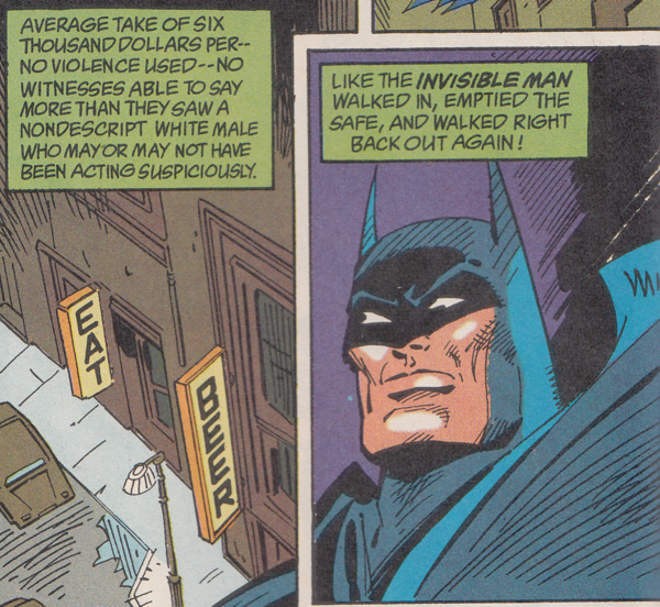 Why does Batman look so smug and satisfied in that panel? He must be thinking how clever it was to equate a nondescript white male to the Invisible Man, especially while thinking about how the image was used for reverse effect by Ralph Ellison. Also, can using the eraser on the image to create glare be any more obvious here? It looks like I did it myself just now!