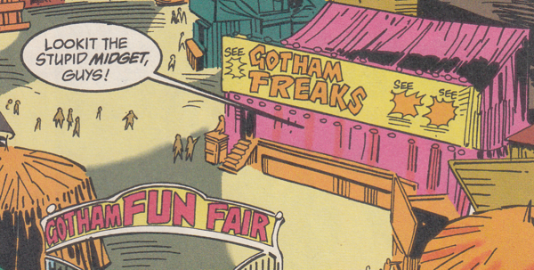 Batman chases this guy down to the "fun fair". It's a place called "Gotham Fun Fair". It's a carnival or a theme park. Probably run by The Joker. When I think of a "fun fair", I think of some shitty little elementary school charity fiasco where they raise money by setting up stupid games, do Cake Walks, and send a metric ton of goldfish to their doom. The "Gotham Fun Fair" has a Ferris wheel and a roller coaster so I'm pretty sure it's more like a boardwalk, especially since it's on Gotham Bay. It also has an old-fashioned freak show where people say words that the kids today would rather throw themselves off of a cliff than ever say out loud.