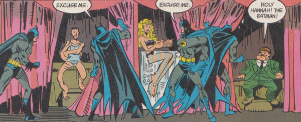Bruce learns that one of the freaks, the guy with no arms and no legs whom they call Texas, hasn't been with the show long. Also, he's about the right size to fit in the duffel bag of the guy Batman encountered on the street. Also a guy with no arms and no legs is the perfect person to slip into a bar, crawl across the floor, climb the bar with their teeth and tongue and lips, pop open the register with their nose, hoover up all the cash into their mouth, and roll back out again without tripping any alarms. Or maybe he just unlocks the door from the inside after being shoved in a barely open window?
