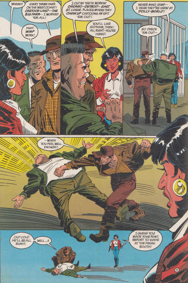 The woman running the freak show, Gina Corolla, looks a little like a G-word so I'd like to move on quickly before the young people reading this get overly anxious about practically nothing. She yells at Batman for assuming her employees were criminals and drives him out. Her freak employees defend Batman's actions and she's all, "Yeah, I guess I'm just a little on edge because I'm horny."