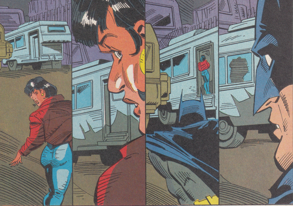 Batman notices Gina sneak back to her trailer when the cops arrive to investigate some petty crimes at the Fun Fair. He follows her for one of two reasons. Either he suspects she's working with the bar robber . . .