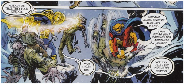 Rating: This was one of those issues that gets shoved in when DC Comics demands a six part story from a writer who only has two to three parts in them. It's just a nonsensical brawl that keeps the characters from entering Nanda Parbat one issue too early. Plus the dialogue is worse than Pickle Boy's dialogue. I don't mean the dialogue he writes. I mean the dialogue he comes up with over a few beers. Talk about strokes!