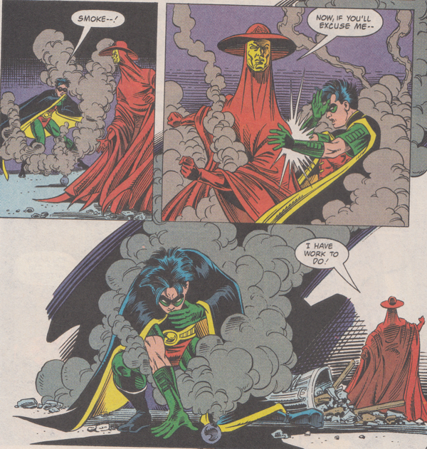 • Anarky torments that artist in the above panel to steal his Black Diamonds which he carelessly uses on his art pieces. Why does he want them? How the fuck should I know? I've almost certainly never read this comic book before and if I have, I wouldn't admit to it. It has fucking Robin on the cover! Blech!