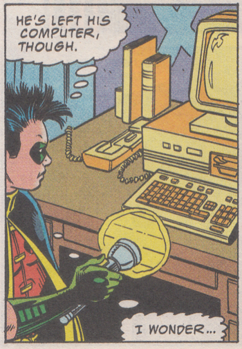 • Not only did Anarky leave his computer, he left all of his computer disks with all of his anarchistic plans on them. It's so convenient that Robin should assume that he's being led into a trap. But Robin doesn't suspect that at all. Robin just suspects he's outwitted Anarky.