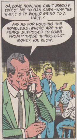 • As Robin leads Anarky away to have him arrested (or maybe set him free. It's not like he waits at the carnival for the cops to show), he scolds him just like I thought Batman would scold him. "You might have the public good in mind but you can't do evil to attain good! Also, you can't find public money for the general good. So you shouldn't even try, idiot!"