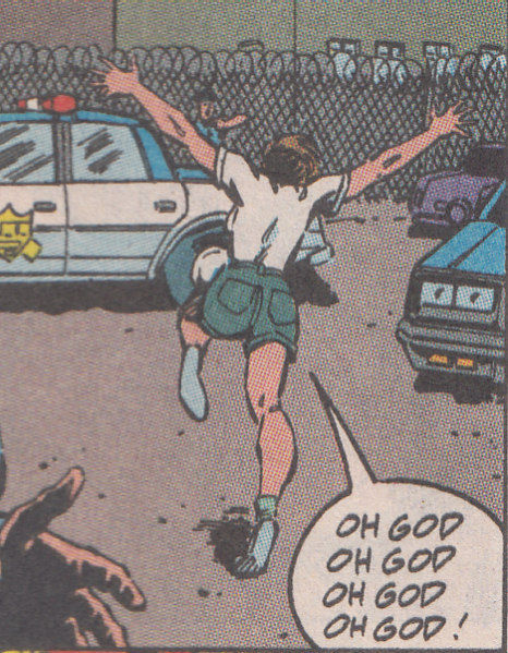 Superman has failed to locate Eclipso because, well, he's not Batman and did Batman do it in Detective Comics? No, he fucking didn't. Although Superman, being able to fly into space and think about flying into space and having the moon be a territory within his reach that he must think about on occasion, should think, "Where would I put my base of operations if I were a being whose entire identity was based around how the moon blocks out the sun?" It's not like it's the most complicated riddle in the world. So instead of searching for Eclipso so he can attack him at the source, Superman flies around Metropolis looking for a couple of Black Diamonds that may or may not be there. Somehow he lucks onto the one person in the city who has a Black Diamond sitting in their pocket. Not because the guy is angry and smashing downtown Metropolis but because he's holding a gun to a woman's head and ranting like a paranoid schizophrenic. Superman doesn't know the guy has a Black Diamond but Bruce Gordon runs up, panting and sweating from his long sprint from Gotham, to tell Superman that the man has a Black Diamond. Bruce Gordon knows because he's got a device that can find Black Diamonds when they're in use or when the plot needs him to know where they are.