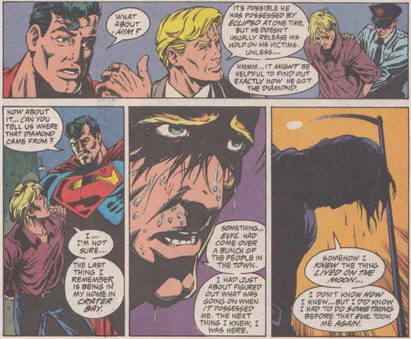 Eclipso, pissed off at everything (which is why he wants to destroy everything. He kind of has to because everything is what made him so mad), monologues a little more information about his plans (unless it's not a monologue when you're kind of talking to the alien in a coma and/or trance floating nearby). Crater Bay is the headquarters for his secret possessing Superman headquarters. The people of Crater Bay network with other possessed people around the world to distribute Black Diamonds to where Eclipso can manipulate leaders, heroes, and even the economy (probably. Maybe he doesn't care about money so much). See? The name of the town is a clue to is location! What an idiot. If I lived in a crater on the moon, I would name my Earth city base of operations, Venusville. It's like how my banking password is "IVENEVERSUCKEDADICKBEFORE".