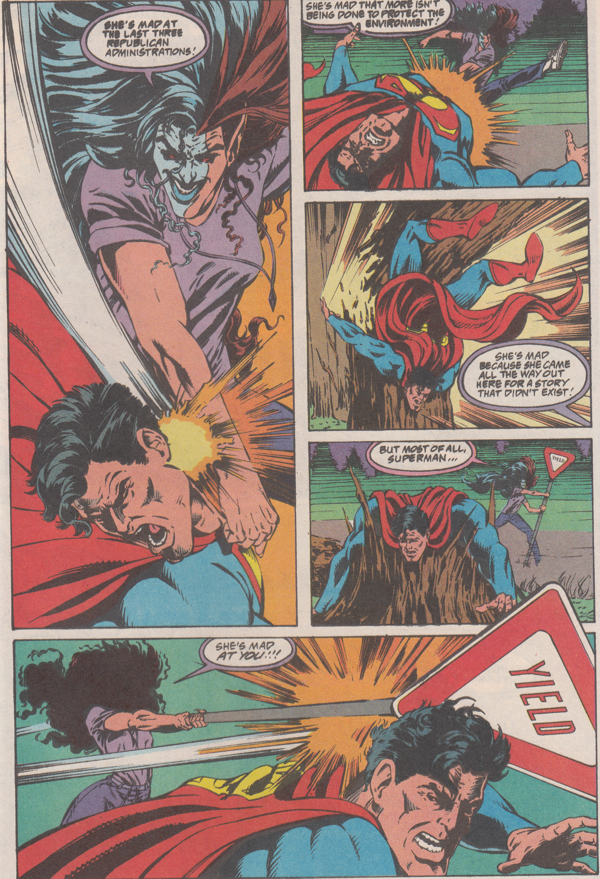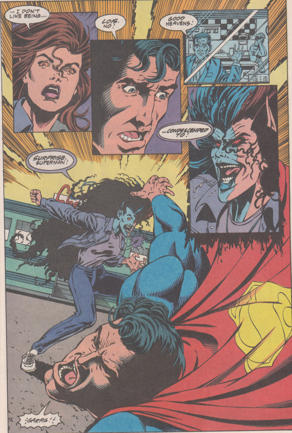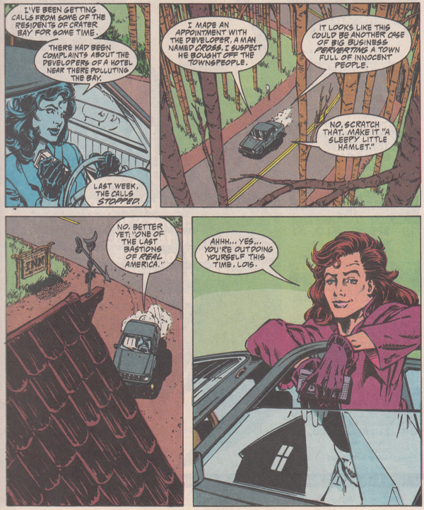 The developer whose wife is being held hostage by Eclipso so that he'll help lure Superman into town spends all night trying to get Lois angry so she'll turn be Eclipsed. He spills two cups of coffee on her and tries to put his hands on her to sop up the spilled beverage but none of it gets her needle moving. No, to get her angry, things have to be personal.
