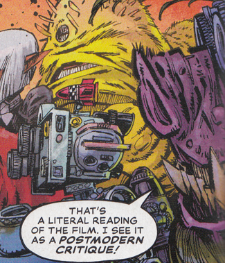 • When Lobo calls his readers the '80s F-word (that's not a literal reading of what he said; it's a postmodern critique!), he's reacting to the bartender's definition of an anti-hero which is "a villain that kills and frags and various other nefarious stuff, but they make jokes while they're doing it. Then they shoehorn in some kinda honorable reason for why they're doing said nefarious stuff." And that right there rules out Lobo anyway! Because he never gets a reason shoehorned in for doing his nefarious stuff! That definition of anti-hero should have been saved for Deathstork #1⁴. That ladyfingers always needs an honorable reason for murdering and pedophiling! But not Lobo! Unless you call "fixing a typo" honorable?