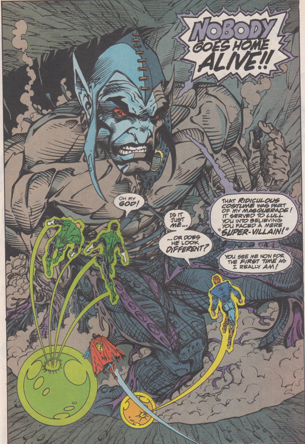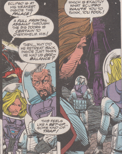 • Everybody follows Starman into the palace where he reveals he's actually Eclipso. Everybody is shocked at the revelation! But more importantly, they're all slightly irritated that he fooled them. And since irritation is the precursor to murderous rage, they all become possessed by the God of Vengeance! But I guess the rules set down through the rest of the series where the possessed have to destroy the thing that caused them rage doesn't apply in the foyer of Eclipso's moon palace because they don't immediately descend on Starman and tear him to bits.