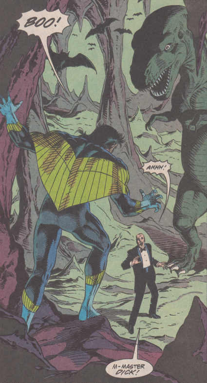 • Nightwing's searching for Superman in the Batcave but Alfred is all, "No Superman here, according to the Batcave Sensors which, as you know, are especially dialed in to detect Superman so Batman can kill him." The fact that Nightwing looks for Superman in the Batcave after Superman's turned evil says a lot about the tenuous relationship between Clark and Bruce. Or Nightwing just figured that Superman had to hide from the sun as Eclipso so why not the Batcave? It's dark and full of people who would beat his ass when they discovered he was there. He might be a great trapeze artist with a stylish mullet and ponytail but he's a shit detective.