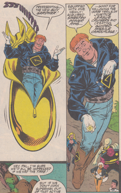 • Guy Gardner makes his debut appearance (since undergoing his transformation in his three issue prestige format series) and really princesses it up. As if a white gloves, a pair of jeans, and cowboy boots are the hottest look of the year.