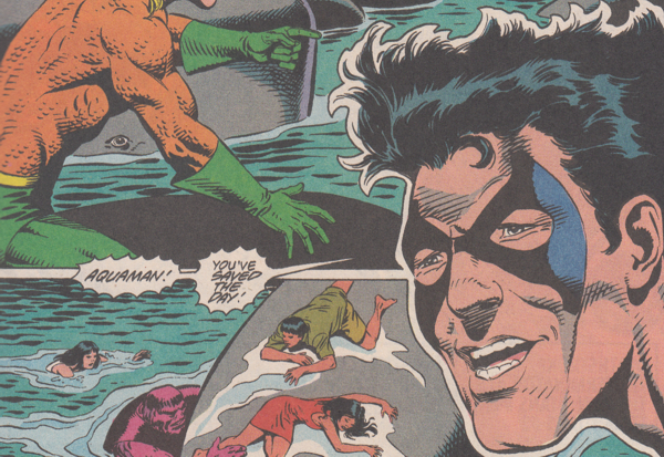 • Having a character exclaim that Aquaman saved the day makes it feel like Aquaman must not have actually saved the day or else why would readers need a massive shot of Nightwing enthusiastically stating it? This feels like Batman got Nightwing alone for a moment early in the morning and said, "If you get the chance, really play up Aquaman's part in the heroics. I feel like he's starting to think he's just as useless as we all know he is."