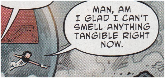 The Terrifics bond a bit in the trash compactor while battling the trash squid. It's the perfect amount of letting the readers get to know the characters and letting them bond realistically so the team doesn't seem as forced as the premise that they'll blow up if they separate balanced with just enough action for the people who like to read comic books. After they escape, they arrive on Bgztl to discover that Phantom Girl was trapped in the Dark Multiverse for thirty-two years which means she's really older than I am and I'm totally allowed to think about putting my tongue in her ass. In your face, judgy judgers!